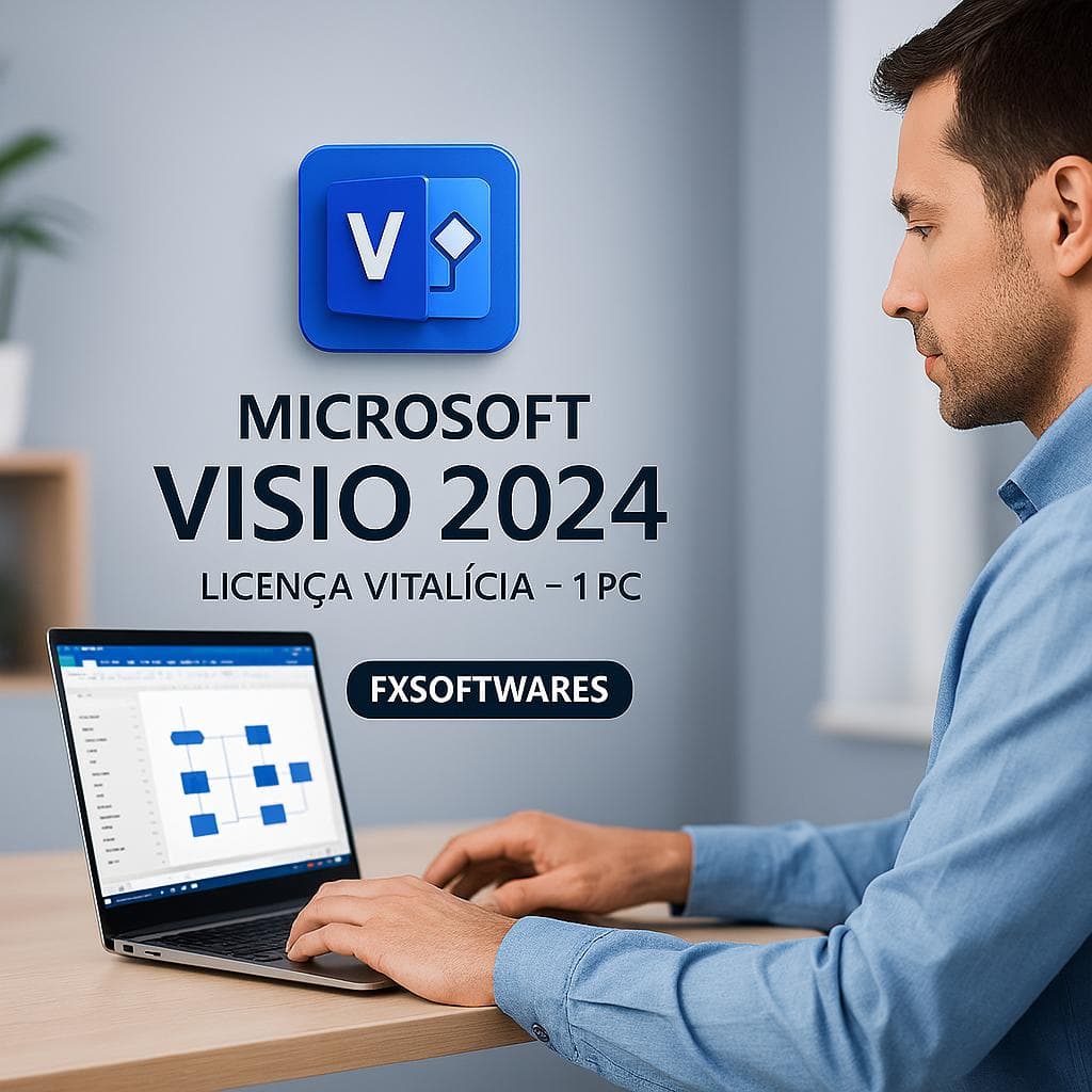 O Microsoft Visio 2024 é a versão mais recente com licença permanente da Microsoft, ideal para criar fluxogramas, diagramas técnicos, redes, organogramas e modelagem de processos com máxima precisão.